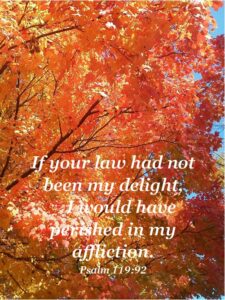 easier to follow after my own heart and pursue my own desires. But this always backfires. Ultimately, something will happen that brings me to my knees and to a place where I am forced to lean and rely on God. In a way, this realization makes me thankful that I have a place to turn when things get rough but it makes me sad for my selfishness and humanity. When it comes down to it, God is always faithful to me even when I am not faithful to Him. But I have found that trials that cross my path become much easier to overcome if I’m already walking with God when I start to fall instead of reaching up for Him when I’ve already hit the ground. This verse speaks with brutal honesty to my experience and convicts my heart of this pattern. I have experienced some rough patches in my life and I’m not sure how I would have gotten through them without having God to carry me through. There are times when the only reason I come through difficult circumstances is because He has been my soft place to land due to my ongoing relationship with Him. This verse teaches me that I need to delight in God’s Word and in His presence in my life when things are at their best so that it can take me safely through the worst.